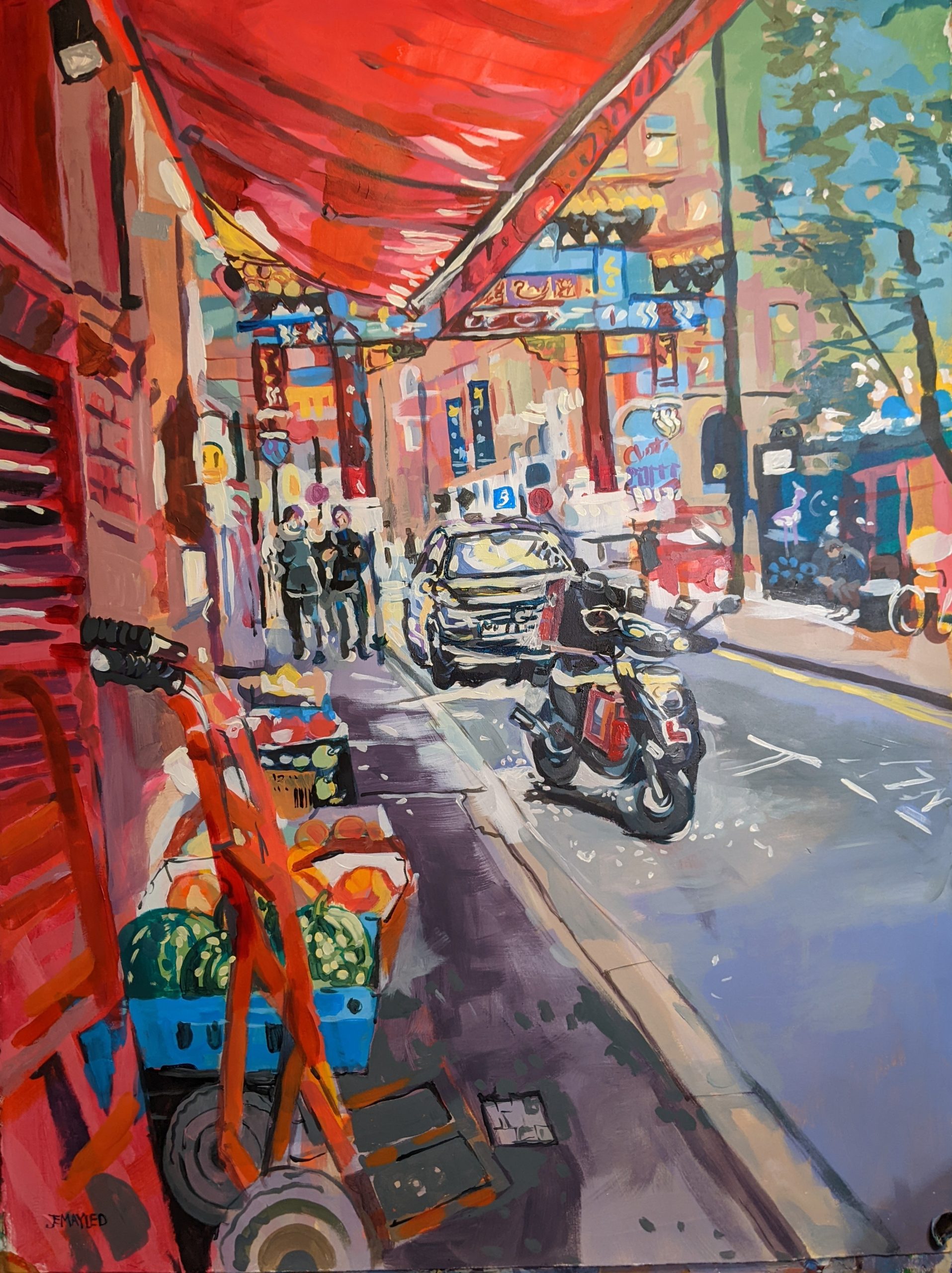 The colourful district of China town in Manchester. Painted with axcrylic on hot pressed watercolour paper. Measuring 54 x 74 cm and sipatched in a sturdy tube.