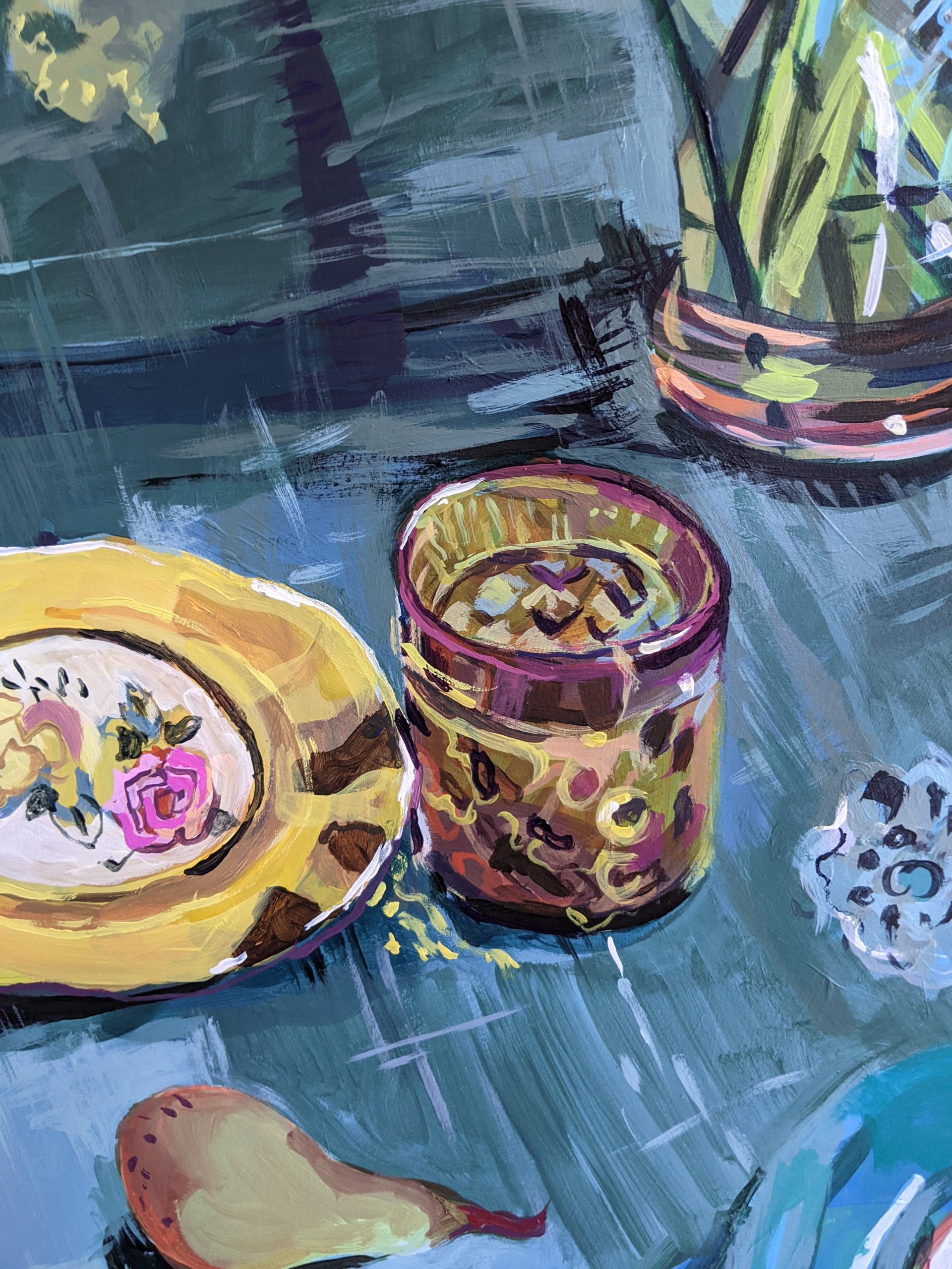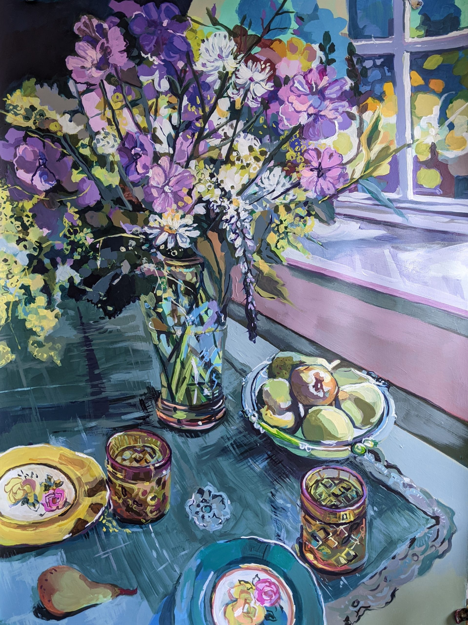 Beautiful things on my friends table observed and recorded using acrylic on hot pressed watercolour paper. Meausirng 54 x 74 cm, presented unframed and dispatched in a sturdy cardboard tube.