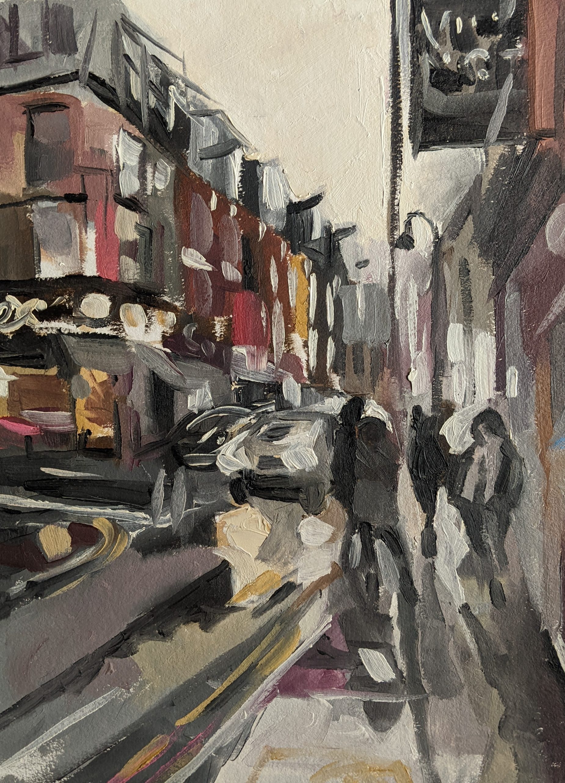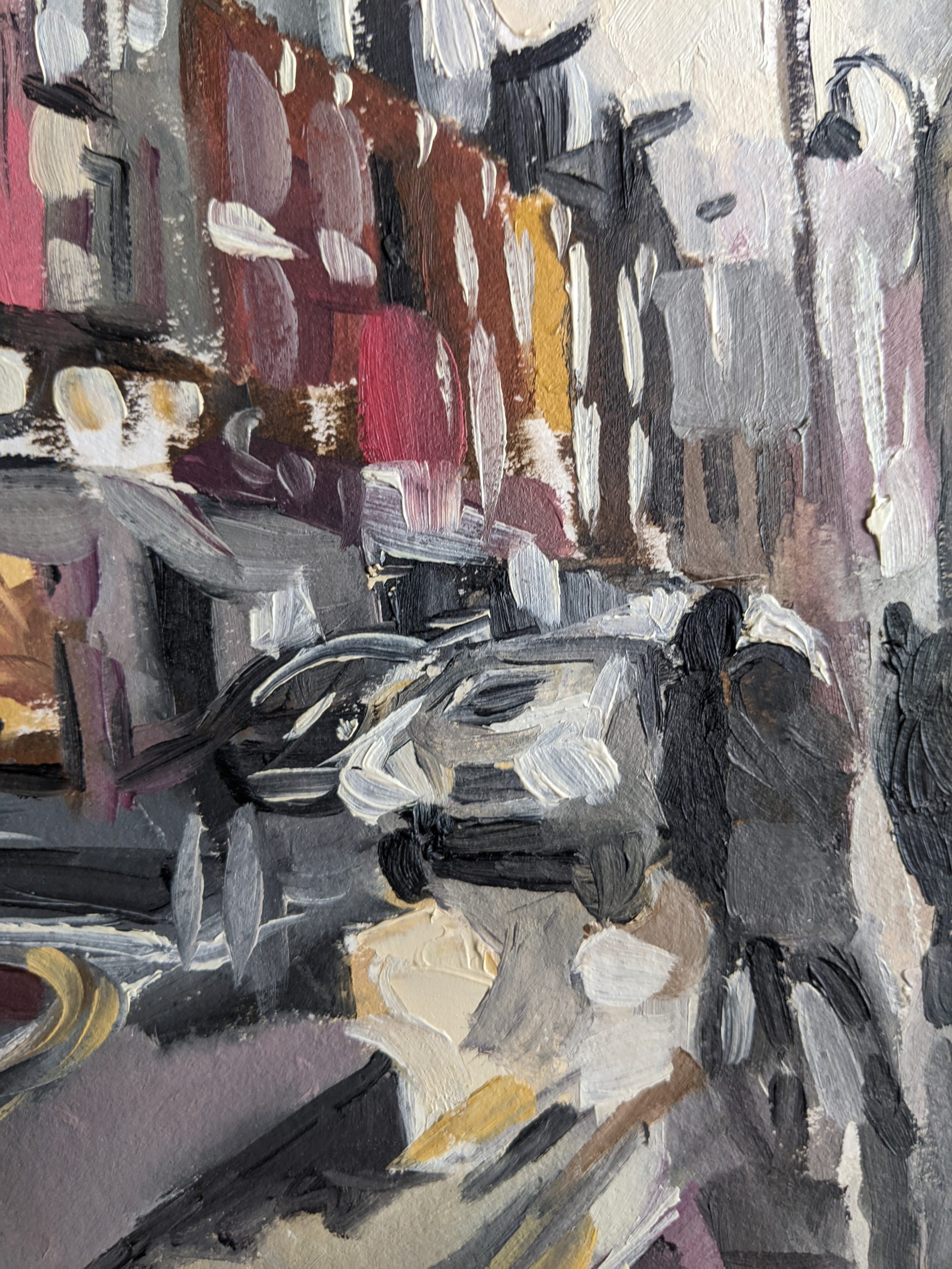 A grey day in the Northern quarter Manchester. Painted with oil on paper and measuring 23 x 31 cm. Presented unframed and dispatched rolled in a sturdy cardboard tube.