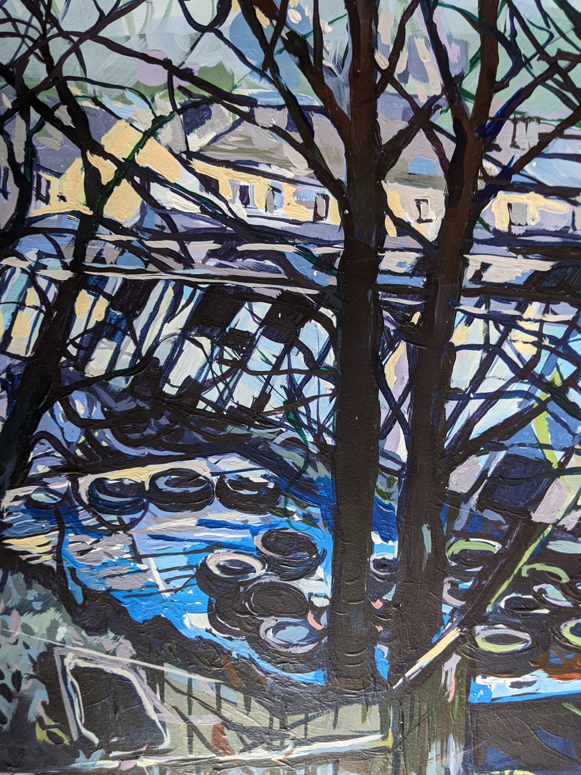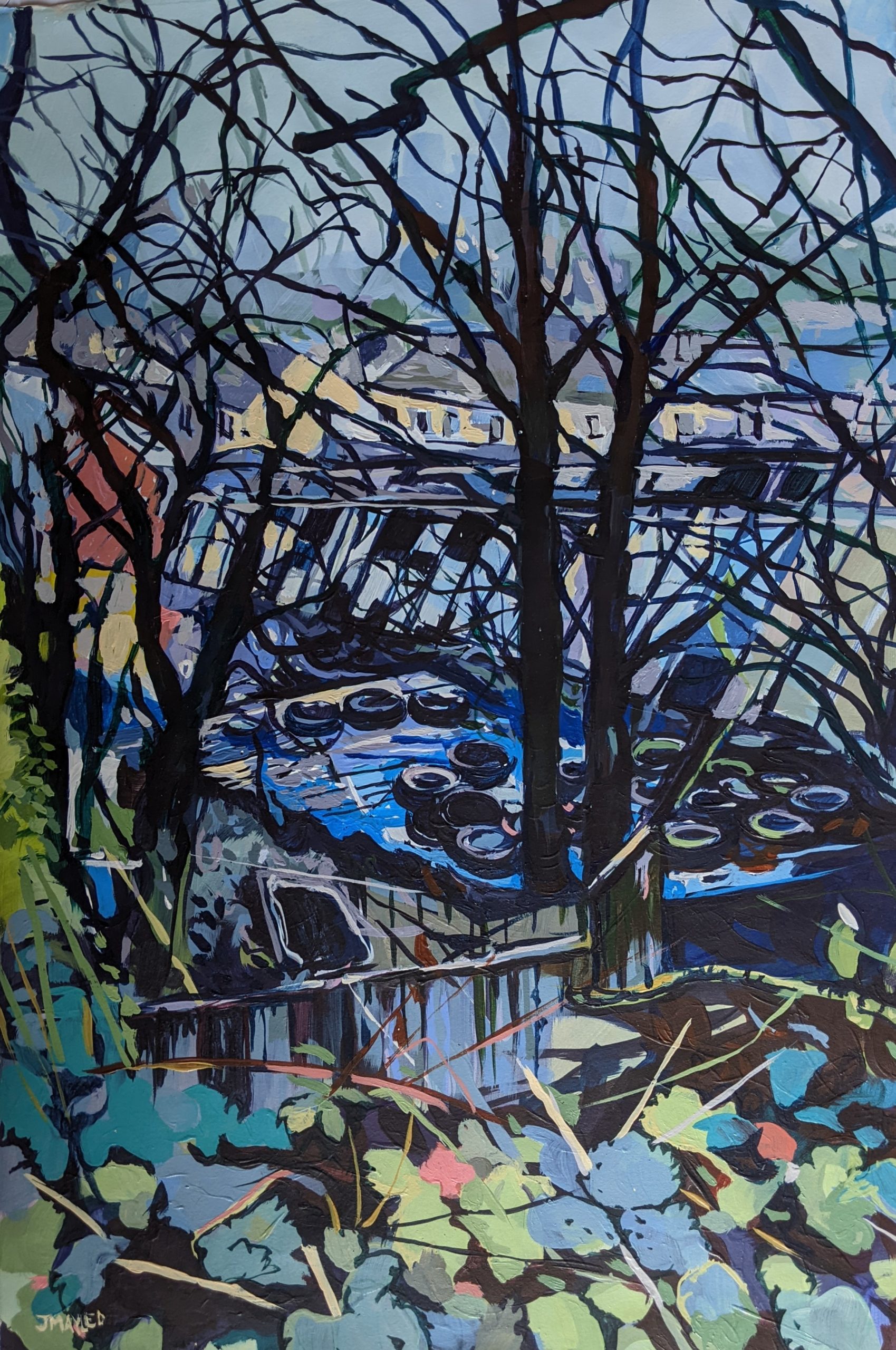 Looking through the trees to an old mill now used for storage and loved the tarpaulins and the tyres. Painted with acrylic on hot pressed watercolour paper, measuring 38 x 56 cm and presented unframed. Dispatched rolled in a sturdy cardboard tube.